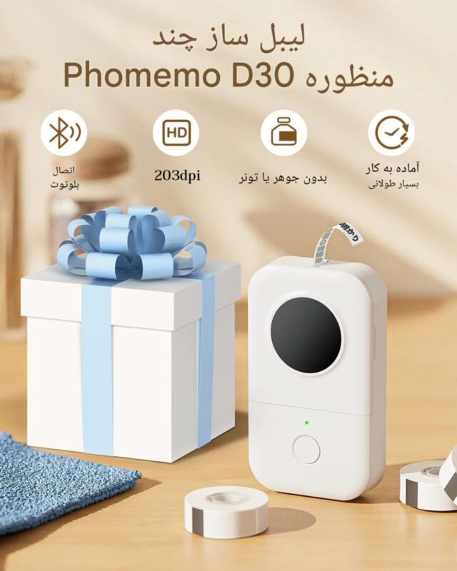 Phomemo D30 | دستگاه لیبل ساز بلوتوثی قابل حمل بدون جوهر – چاپگر لیبل حرارتی با کیفیت 203 DPI