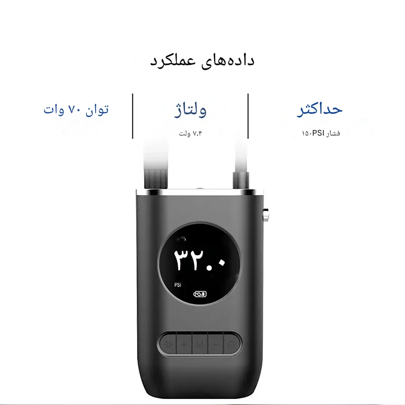 این دستگاه مجهز به موتور ۵۰ واتی و باتری لیتیومی ۴۰۰۰ میلیآمپر ساعتی است که بدون نیاز به برق یا سیم، چندین تایر را بهراحتی باد میکند. ولتاژ کاری ۱۲ ولت (DC) و فشار خروجی تا ۱۵۰ PSI تضمین میکند که برای خودروهای سواری، موتور سیکلت، دوچرخه و توپها کاملاً مناسب باشد.