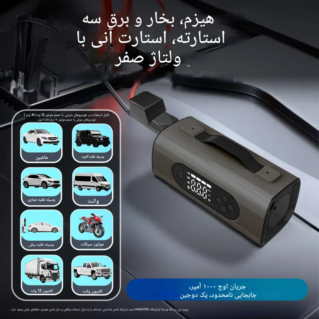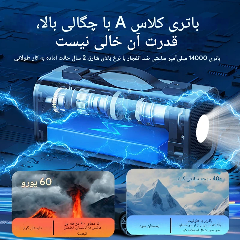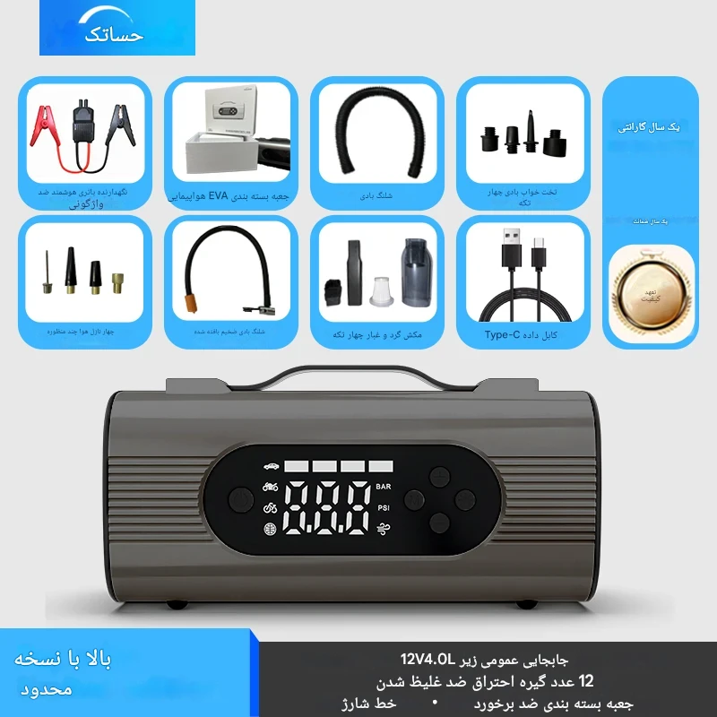 8 کاره (جامپ استارتر، پمپ باد، جارو شارژی، پاوربانک، دمنده/مکنده، چراغ قوه، نشانگر باد، SOS) |