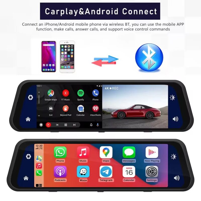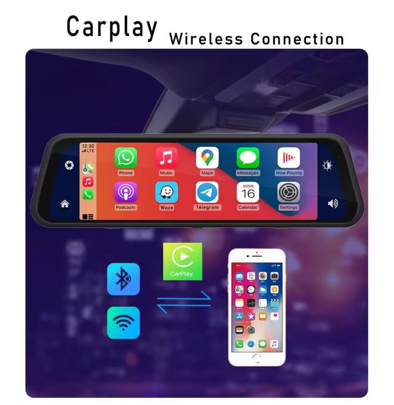 با پشتیبانی از Apple CarPlay و Android Auto، گوشی خود را از طریق بلوتوث یا وایفای به آینه متصل کنید و از امکانات فوقالعادهای مانند کنترل تماس، مسیریابی، پاسخ صوتی به پیامها و نمایش اپلیکیشنها روی آینه بهرهمند شوید.
