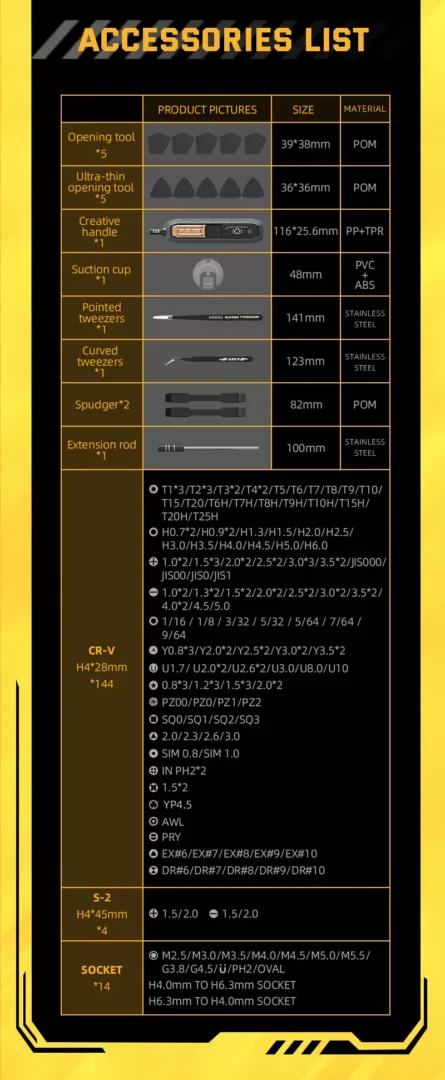 کاربرد: این ست برای تعمیرات لوازم الکترونیکی مانند تلفنهای همراه، لپتاپها، ساعتها، دوربینها، اسباببازیها، و همچنین تعمیرات لوازم خانگی مانند قهوهسازها، مایکروویوها، و کنسولهای بازی مناسب است.