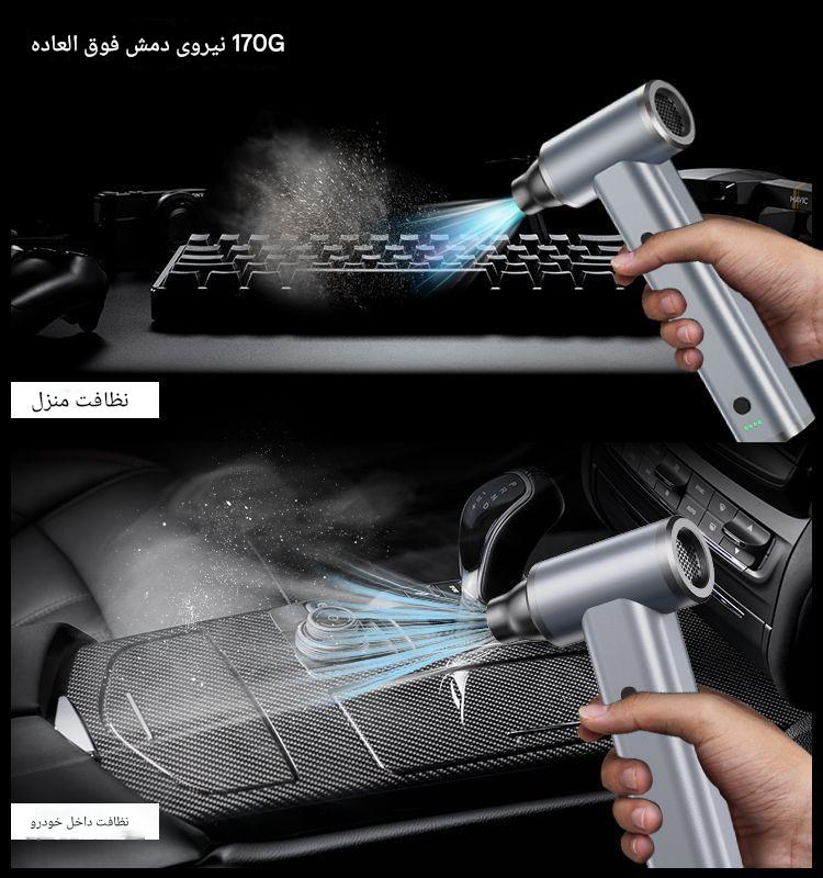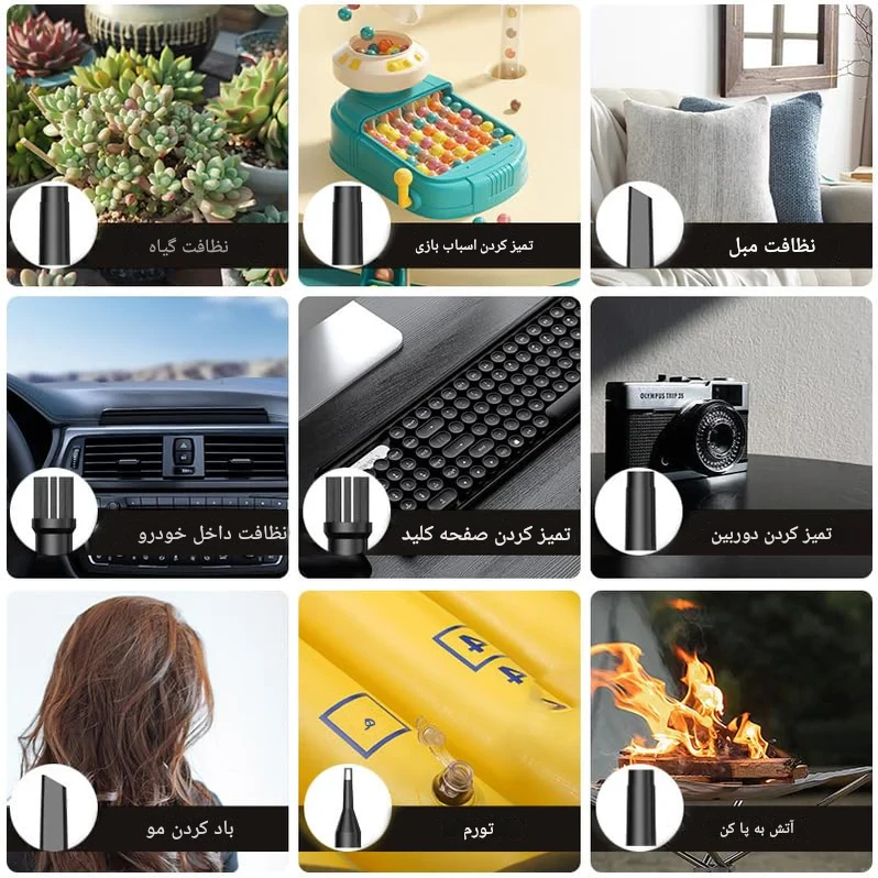 تمیز کردن خودرو، منزل، وسایل الکترونیکی، باد زدن، روشن کردن آتش، چکش اضطراری و… |