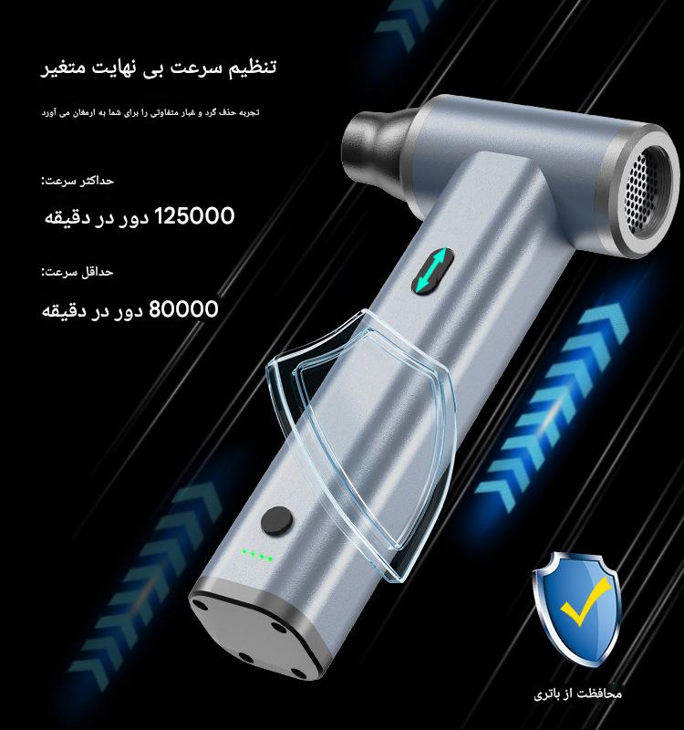 مجهز به موتور براشلس قدرتمند با سرعت ۱۲۵۰۰۰ دور در دقیقه، این جت فن قابلیت دمندگی، مکش و استفاده بهعنوان چکش اضطراری را داراست. از آن میتوان برای خشککردن سریع خودرو پس از شستوشو، تمیز کردن داخل ماشین، باد زدن وسایل بادی، روشن کردن زغال و حتی خنکسازی تجهیزات الکترونیکی استفاده کرد.