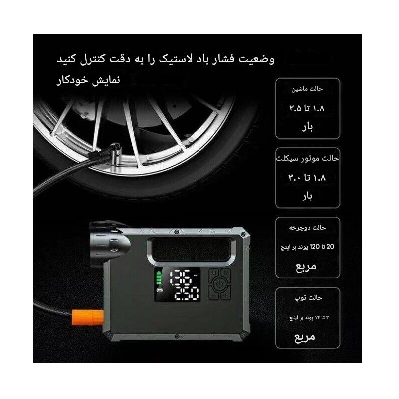 کمپرسور باد قدرتمند این دستگاه، با فشار 150PSI قادر است یک لاستیک خالی را در عرض ۶ دقیقه باد کند. پاوربانک داخلی آن نیز با خروجیهای مختلف، دستگاههای الکترونیکی شما را به سرعت شارژ میکند.