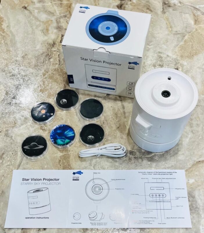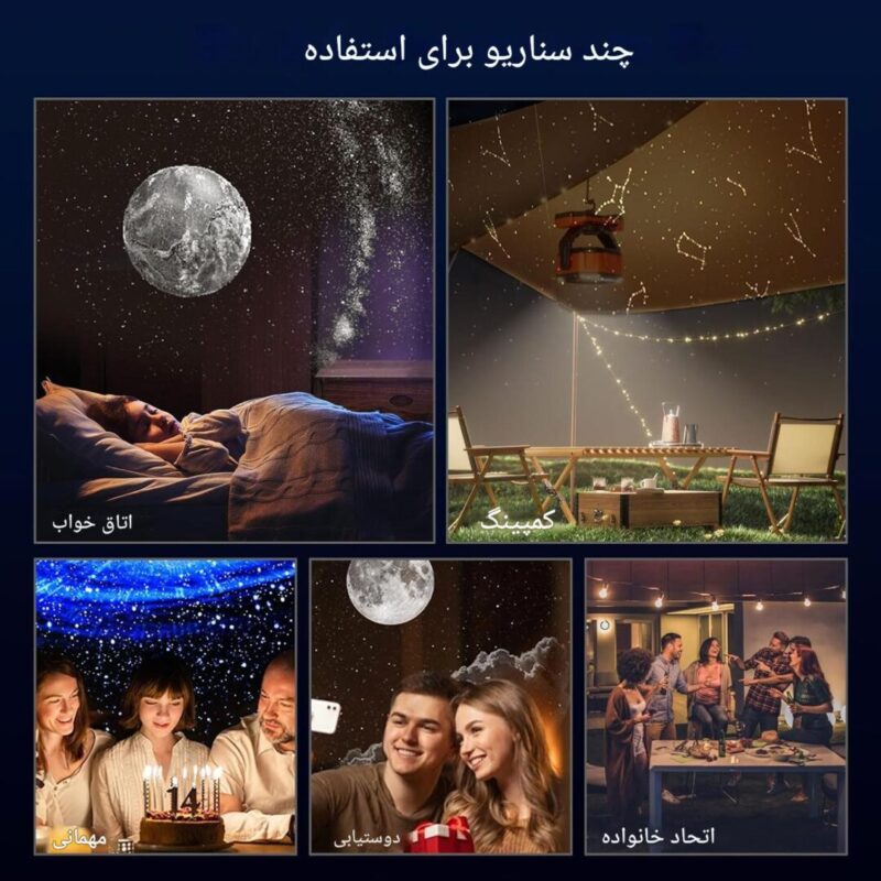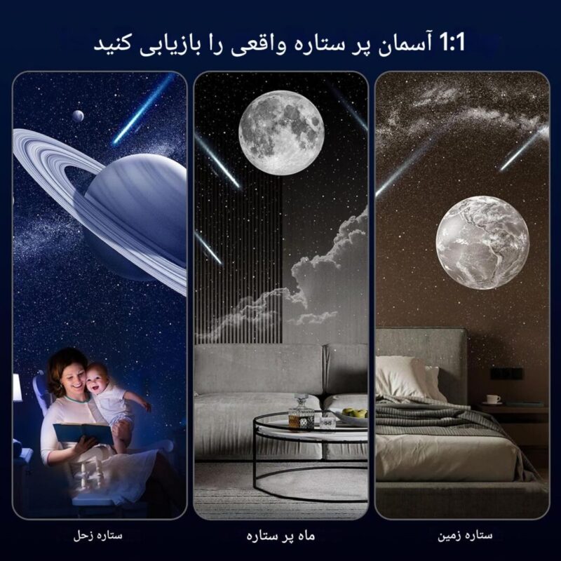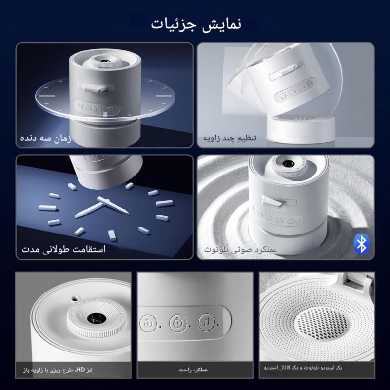 پخش موزیک های آرامش بخش, دارای 6 طرح مختلف, دارای اسپیکر, قابلیت تنظیم زاویه تا 45 درجه, نمایش انواع کهکشان ها و آسمان شب, نمایش بارش های شهابی |